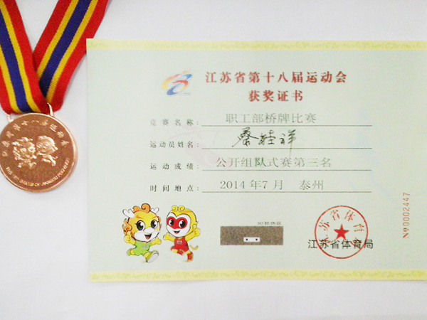 7月20-26日,江蘇省第十八屆運(yùn)動(dòng)會(huì)職工部橋牌比賽在泰州市舉行,應(yīng)蘇州市總工會(huì)邀請(qǐng),我公司職工蔡桂祥代表蘇州市參賽。經(jīng)過(guò)激烈角逐,蘇州代表隊(duì)獲得了團(tuán)體第三名的好成績(jī),蔡桂祥個(gè)…